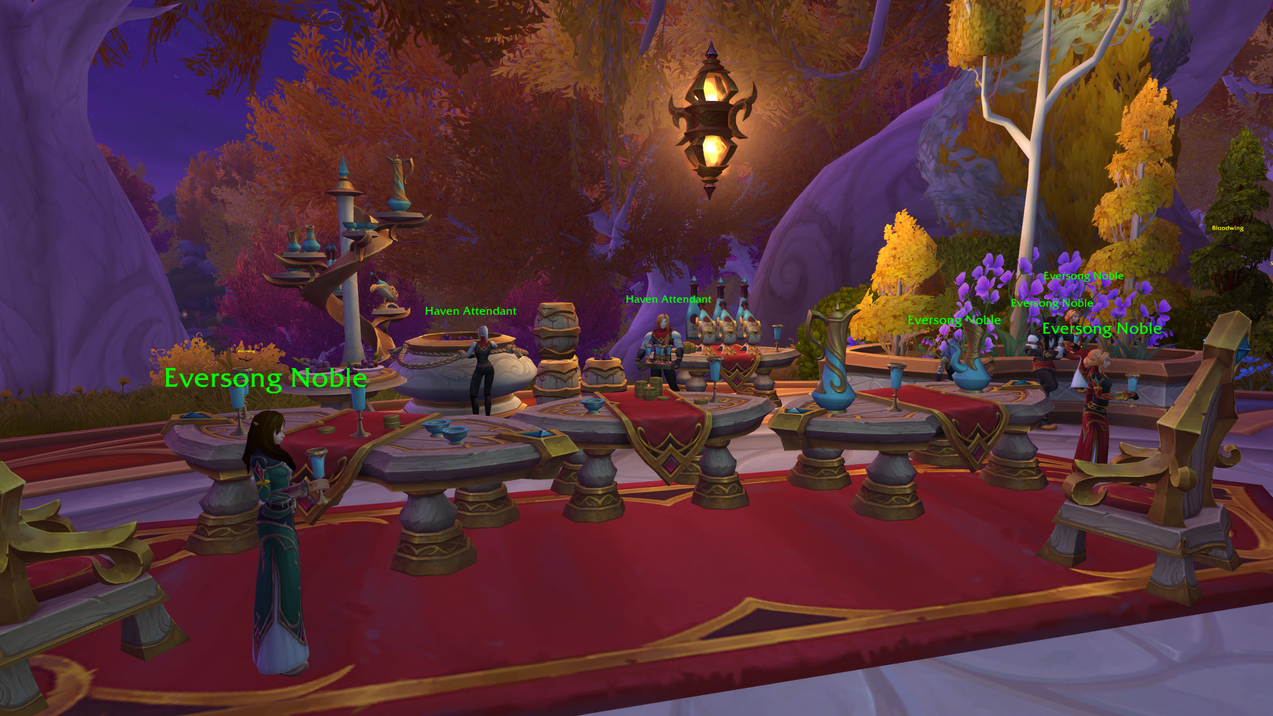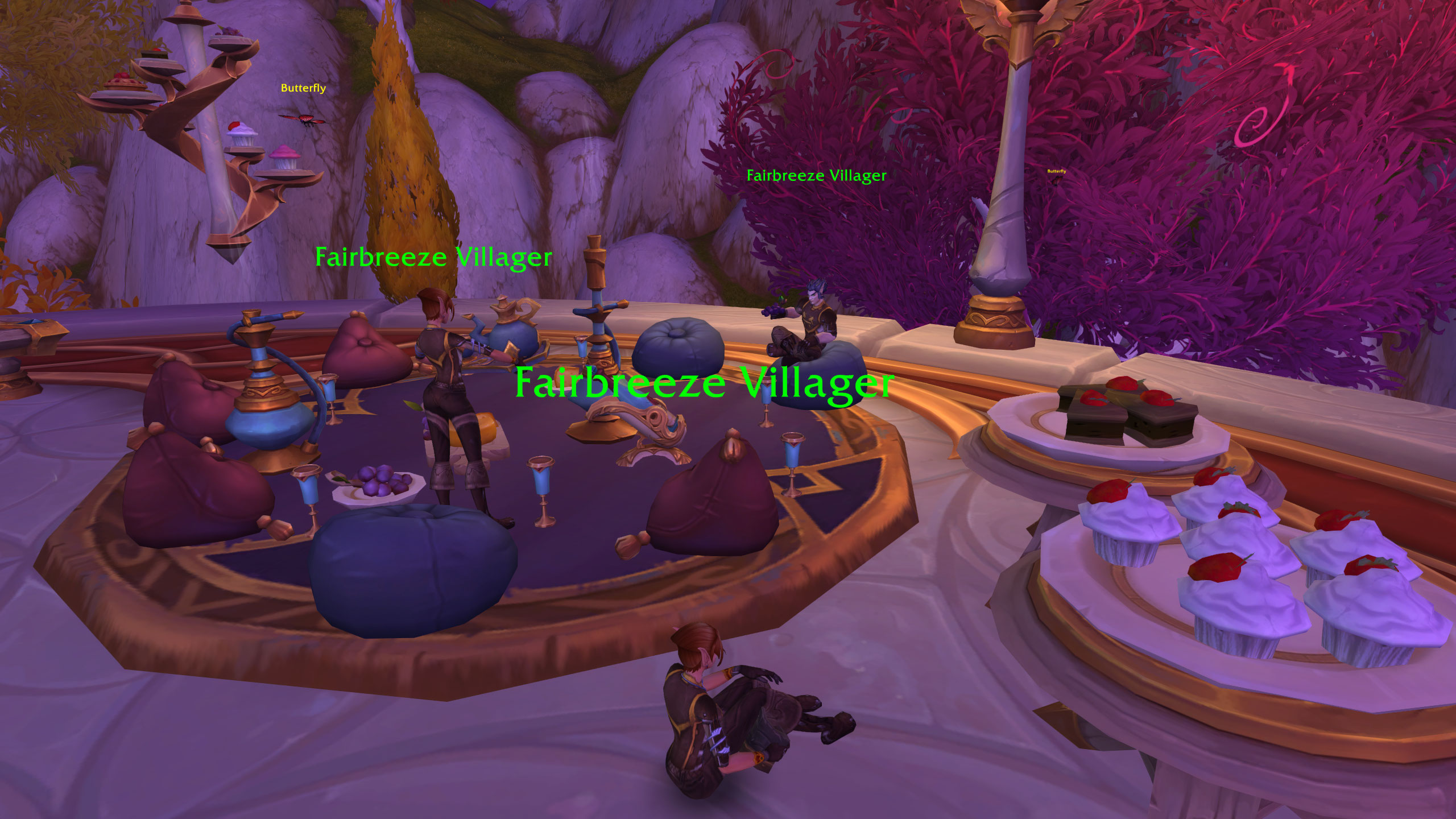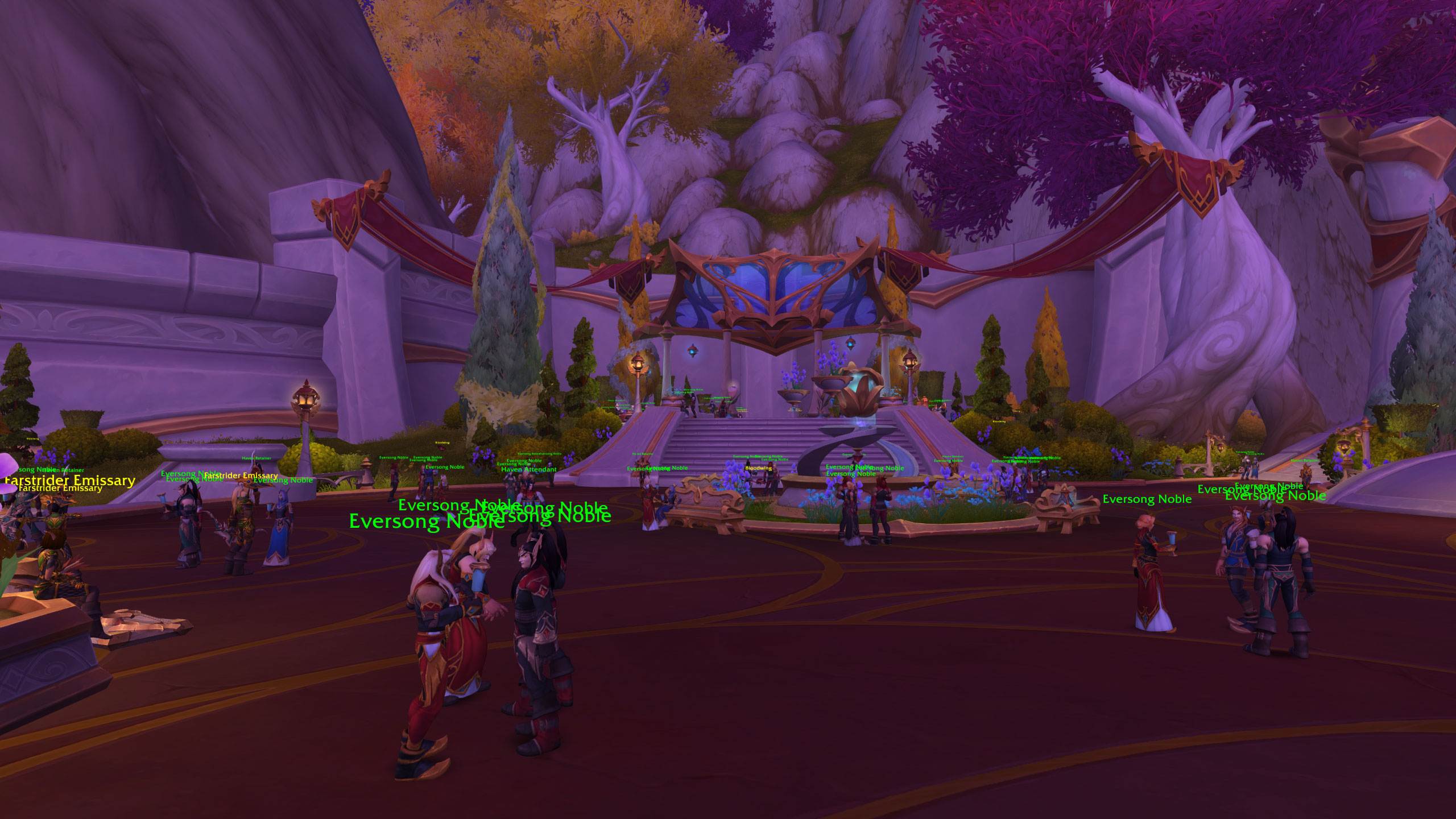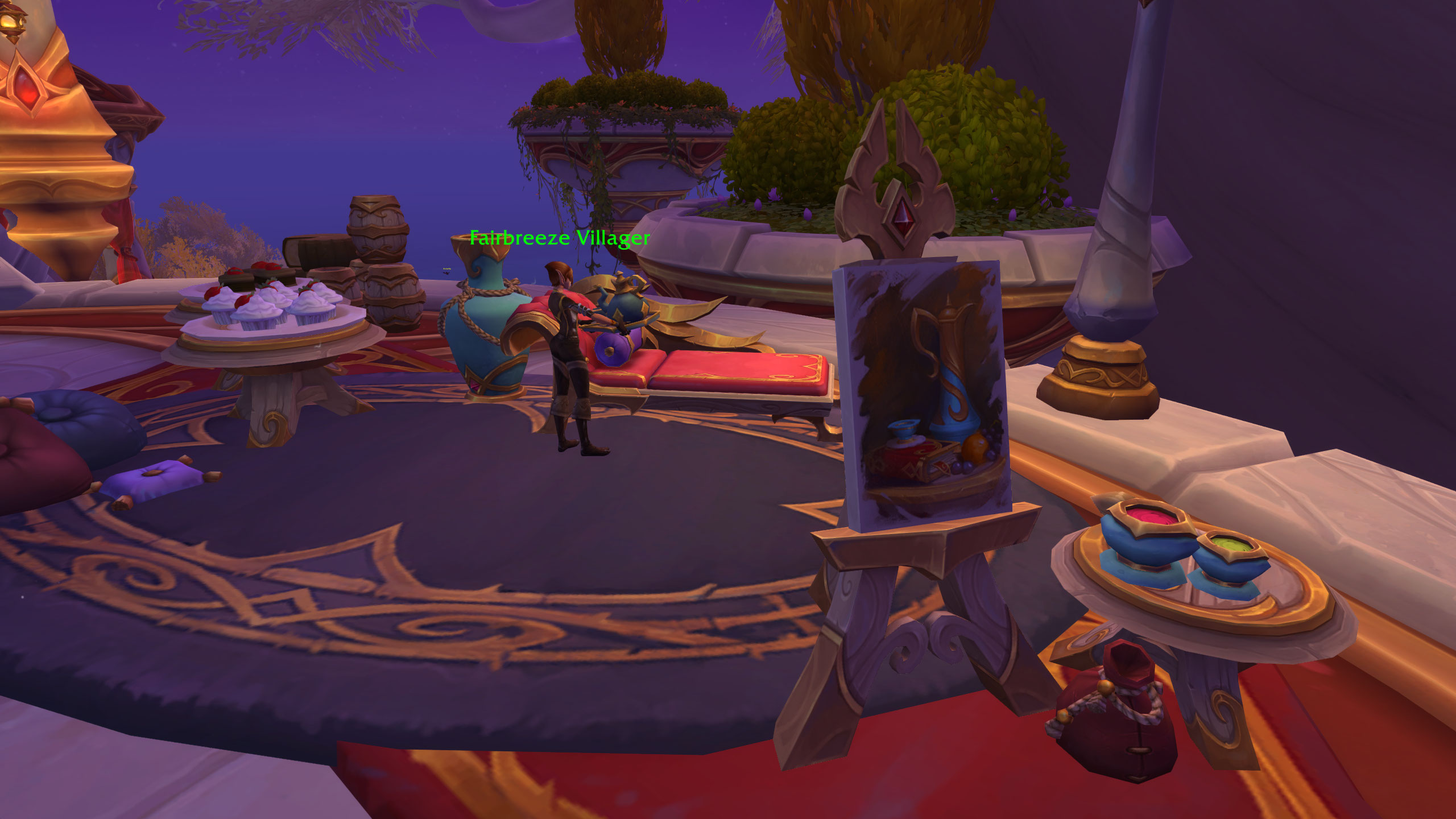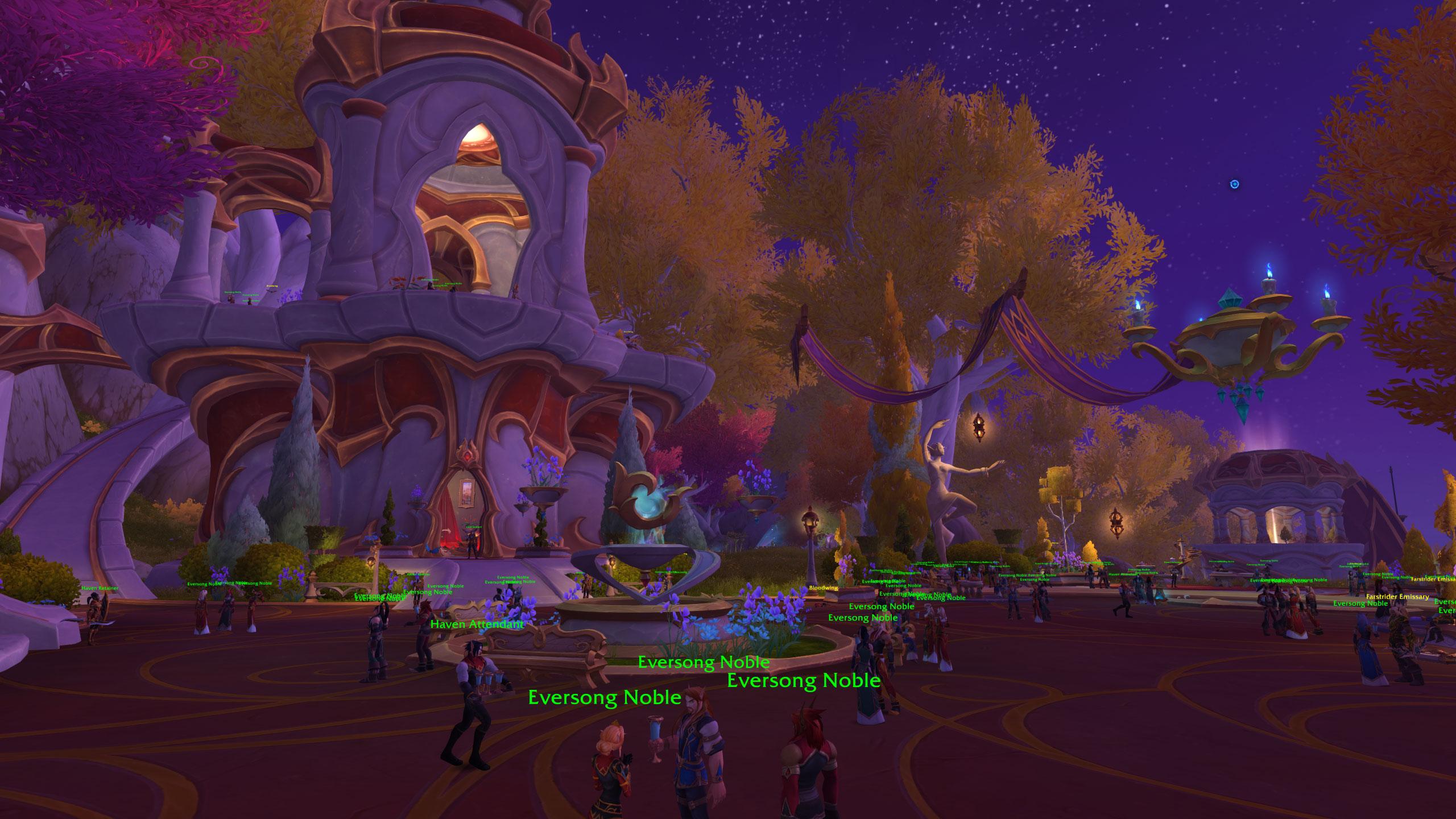 These are Fairbreeze Village screenshots as it looks currently in World of Warcraft: Midnight (Beta 64339). The flightmaster is at the top of the floating building surrounding the massive tree. Many High Elves, including Eversong Nobles, Magisters, Blood Knights, Farstriders, and Shades of the Row, are welcome to the parties tended by Lord Saltheril.