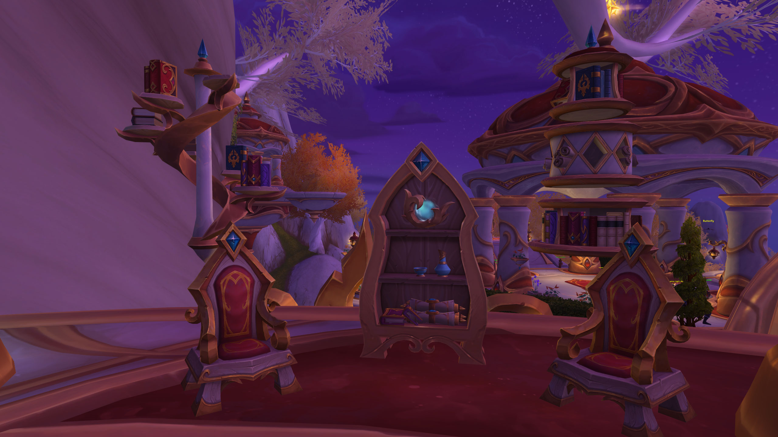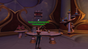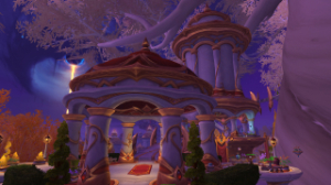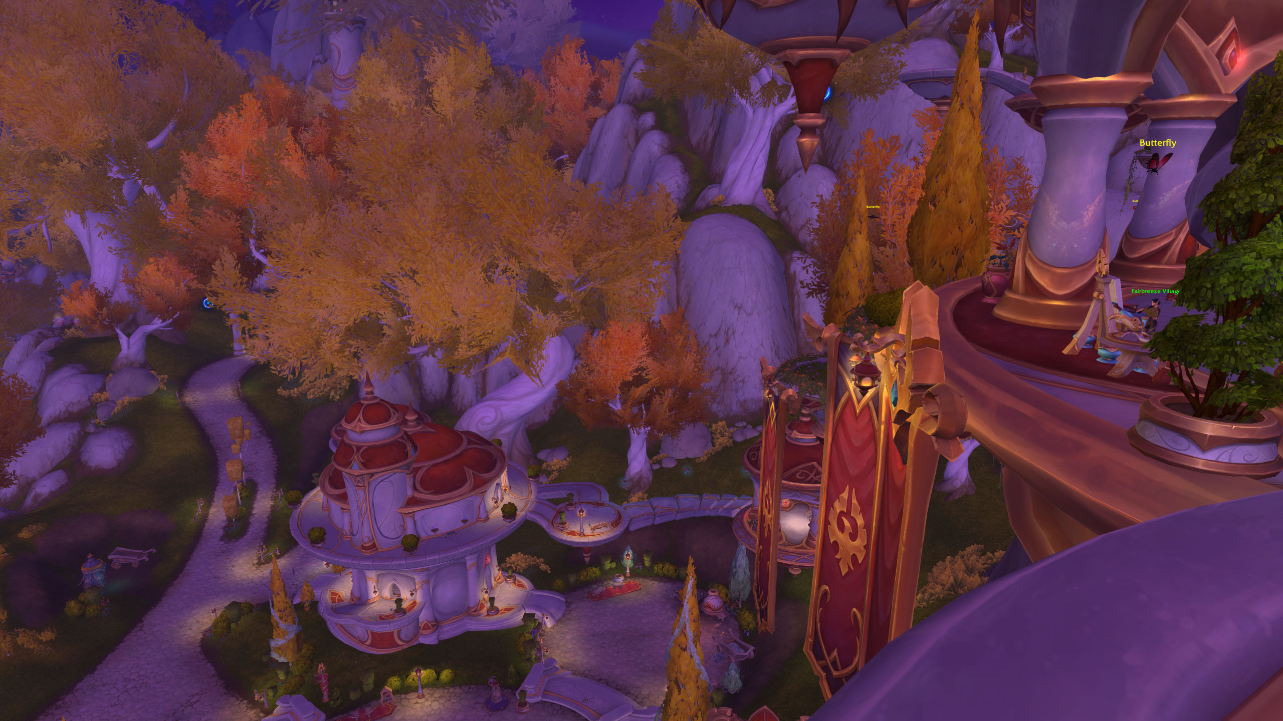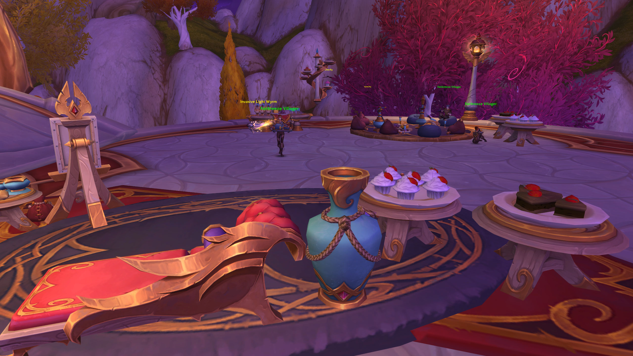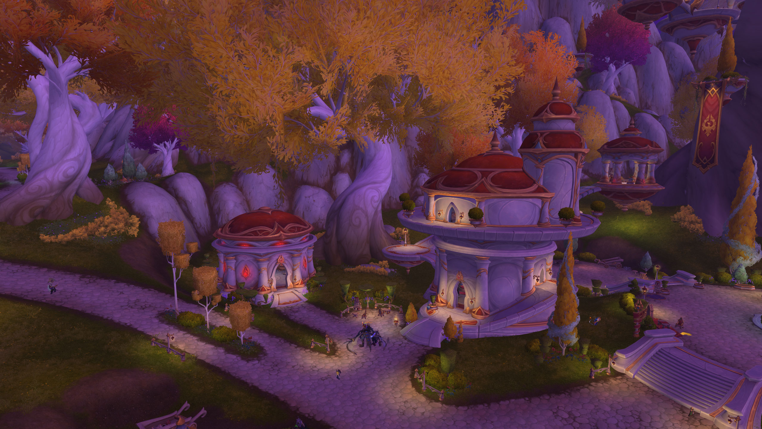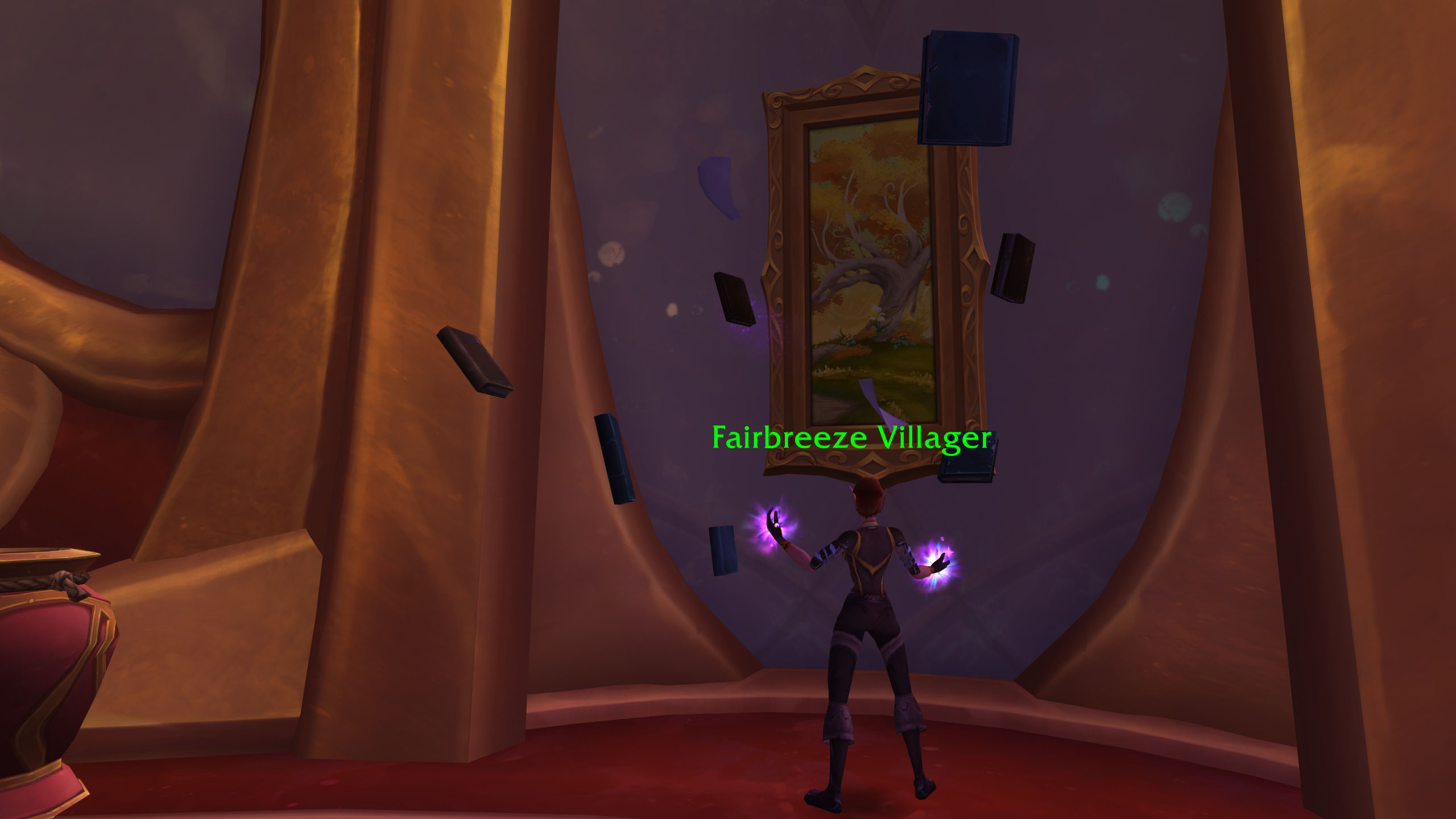 These are Fairbreeze Village screenshots as it looks currently in World of Warcraft: Midnight (Beta 64339). The flightmaster is at the top of the floating building surrounding the massive tree. Many High Elves, including Eversong Nobles, Magisters, Blood Knights, Farstriders, and Shades of the Row, are welcome to the parties tended by Lord Saltheril.